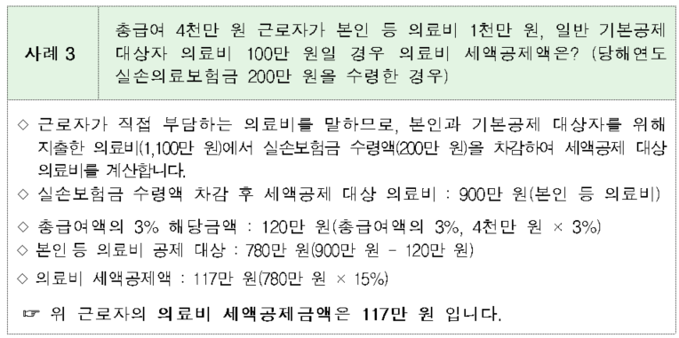 - 의료비 공제는 총 급여액의 3%를 초과하는 금액부터 가능합니다.