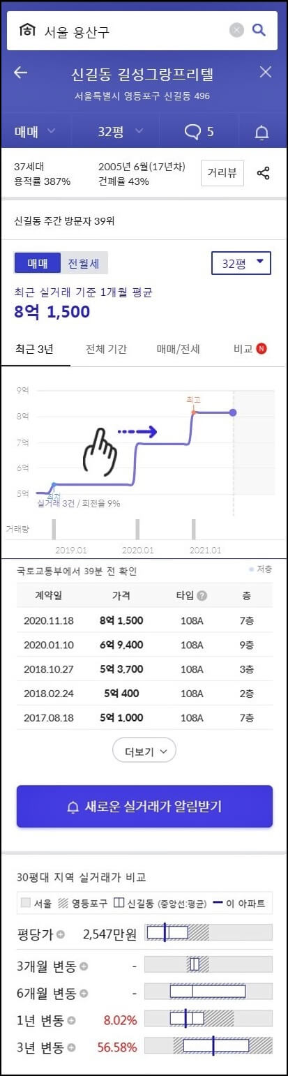 - 신고가: 최근 3개월간의 신고된 거래 가격과 상승률을 확인할 수 있습니다.