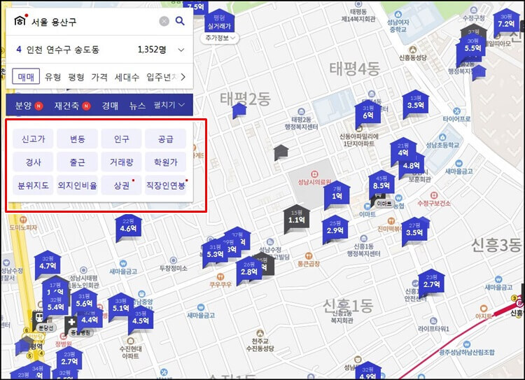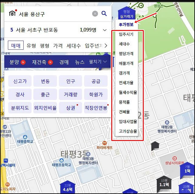 왼쪽 상단의 추가 정보를 클릭하면 아래 이미지처럼 여러 메뉴가 서브메뉴(입주 기간, 세대 수 등)로 나타납니다. 이 메뉴들 중 주요하게 살펴볼 것들은 다음과 같습니다.