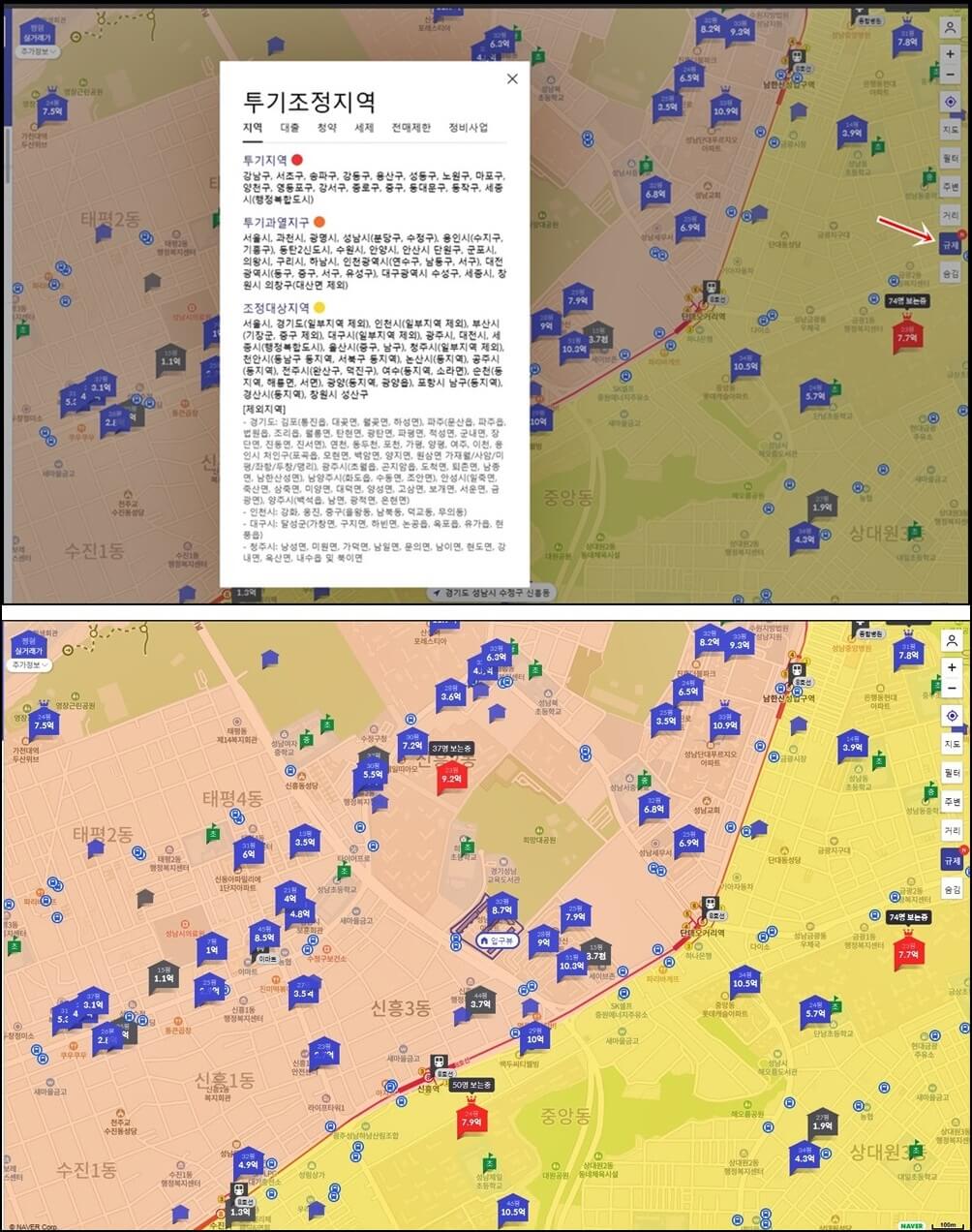 부동산 시장에서의 중요한 요소 중 하나는 정부의 규제입니다. 호갱노노의 메인 페이지 우측에 위치한 [규제] 메뉴를 사용하면 '조정대상지역', '투기지역', '투기과열지구' 등 규제지역이 색깔별로 구분되어 지도상에 표시됩니다. 이를 통해 부동산 관련 세금, 청약, 대출규제 등의 정보를 한눈에 파악할 수 있어, 투자나 구매 결정에 큰 도움이 됩니다.