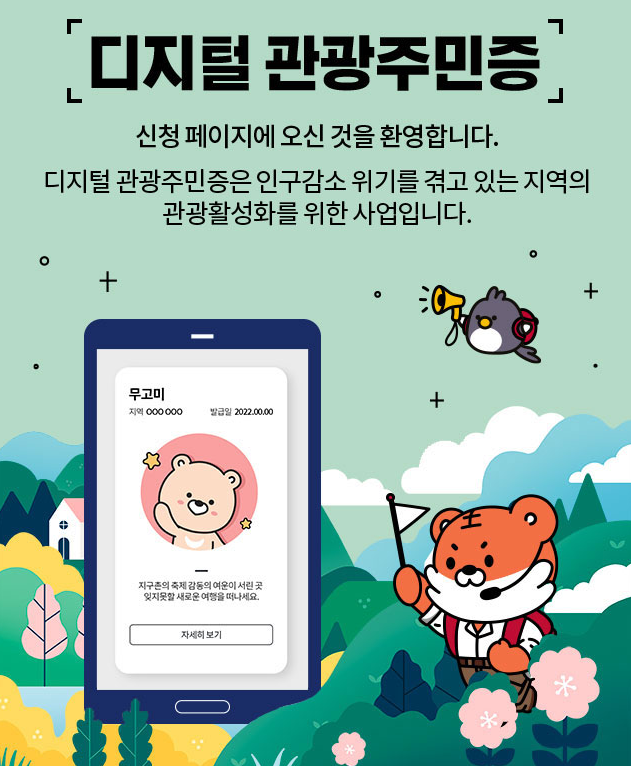 디지털 관광주민증은 문화체육관광부와 한국관광공사가 인구 감소 위기를 겪고 있는 지역의 관광 활성화를 위해 추진하는 사업입니다. 이 주민증을 통해 관광지 입장권, 숙박, 식음, 체험 등 다양한 여행 편의시설과 체험 프로그램에서 할인 혜택을 받을 수 있습니다.